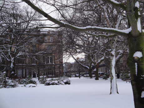 The view to the south-west across a winter canopy is dominated by the handsome spires of St. Mary's Cathedral (Palmerston Place). Unlike the day this photograph was taken, Torphyn Hill should be seen in the distance just in front of the splendid Pentland Hills, views, including the Gardens, that are only available to occupants of upper flats
