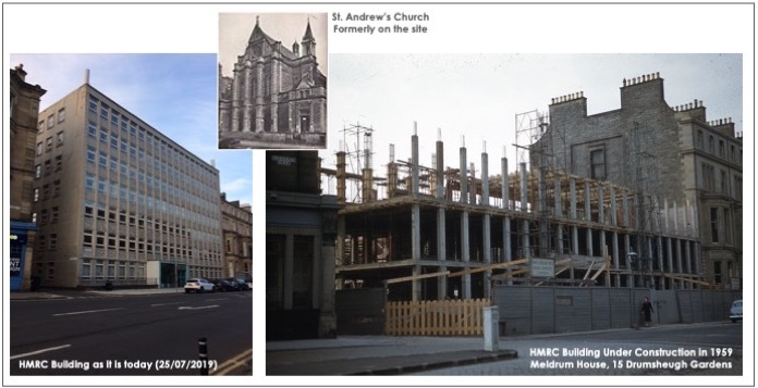 Meldrum House, for many years occupied by Her Majesty's Revenue & Customs is shown here under construction during the year 1959 (kindly provided by Margaret Hedge). The left-hand image shows the buiding in July 2019 with protective sheeting designed to retain elements of spalling concrete cladding for safety reasons. Built on the site of the former St. Andrew's Church, it was designed at a time when Government buildings were not subjected to Planning Permission, hence such an unfit building for its fine Victorian surroundings. The site received Planning Permission for redevelopment to an 'Aparthotel' comprising 166 units, due for completion in Summer 2024, as The Resident, a well-respected group in the ownership of the Mactaggart Family & Partners. The Resident successfully operates hotels in London (Covent Garden, Victoria, Kensington) and Liverpool.
