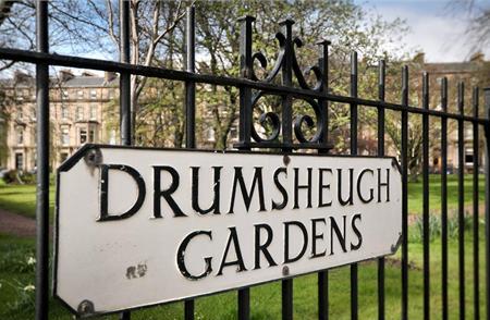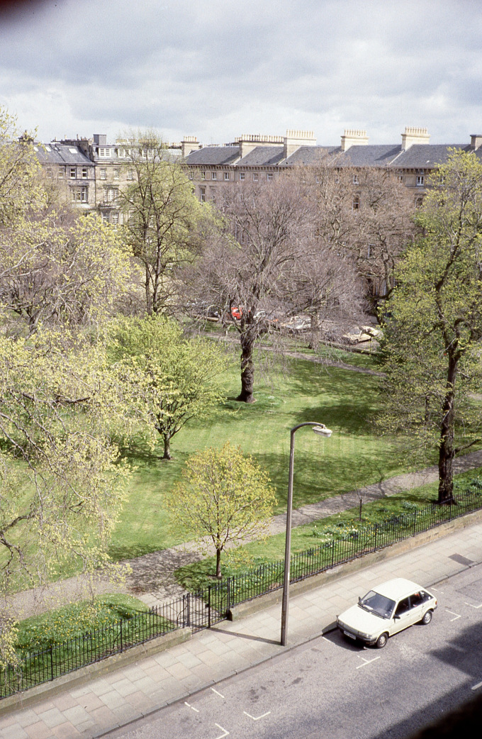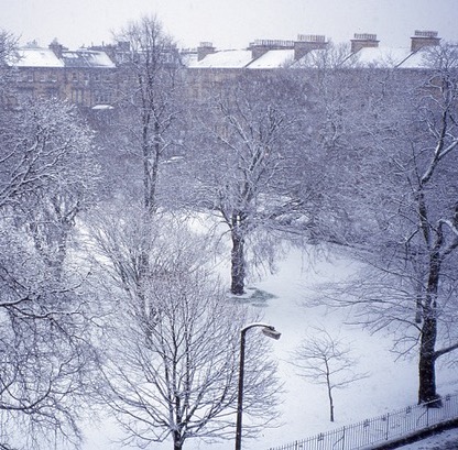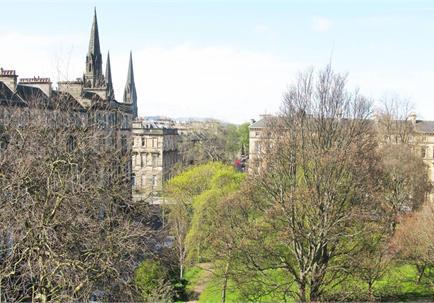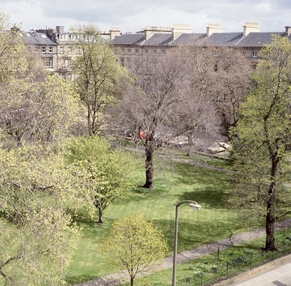 The view to the south-west across a winter canopy is dominated by the handsome spires of St. Mary's Cathedral (Palmerston Place). Unlike the day this photograph was taken, Torphyn Hill should be seen in the distance just in front of the splendid Pentland Hills, views, including the Gardens, that are only available to occupants of upper flats