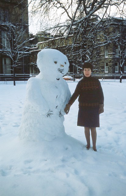 The view from the South side looking North in Spring 1992 (top left) and Winter 2001 (bottom left). Winter 1978 (centre) featuring Margaret Hedge with a prized snowman. The photo on the right was taken in 1992, looking down on the South gate with a lonely parked car. All these photographs were provided by Ian & Margaret Hedge who's joint devotion to the Gardens at Drumsheugh over many years has been exemplary.