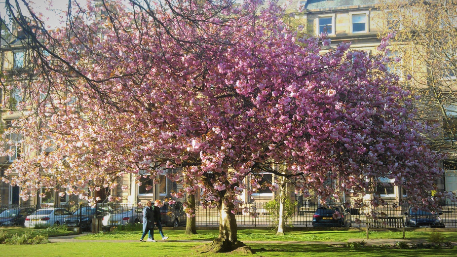 Cherry Tree photographed by Derek Matchett in April 2020, with the permission of the two residents passing as he took the shot. This was taken during a period of 'Lockdown' as imposed by the Government as a result of the Coronavirus pandemic, with people allowed to take one walk per day while otherwise self-isolating at home