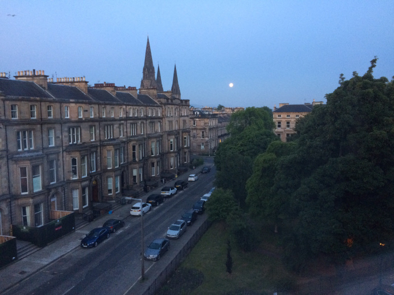 A Full Moon sinking into the West on an early morning, 28th June 2018, long before the daily morning commute and drag racing starts both ways along Drumsheugh Gardens and Chester Street